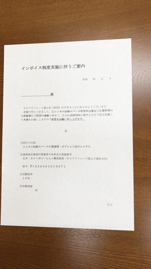 ご案内が遅くなりましたが、セルフストレージ富山を運営するSコーポレーション(株)は適格請求書発行事業者として申請し既に登録されております。(登録番号:T7230001019571)