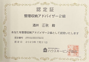 当店スタッフの「整理収納アドバイザー2級」資格取得について